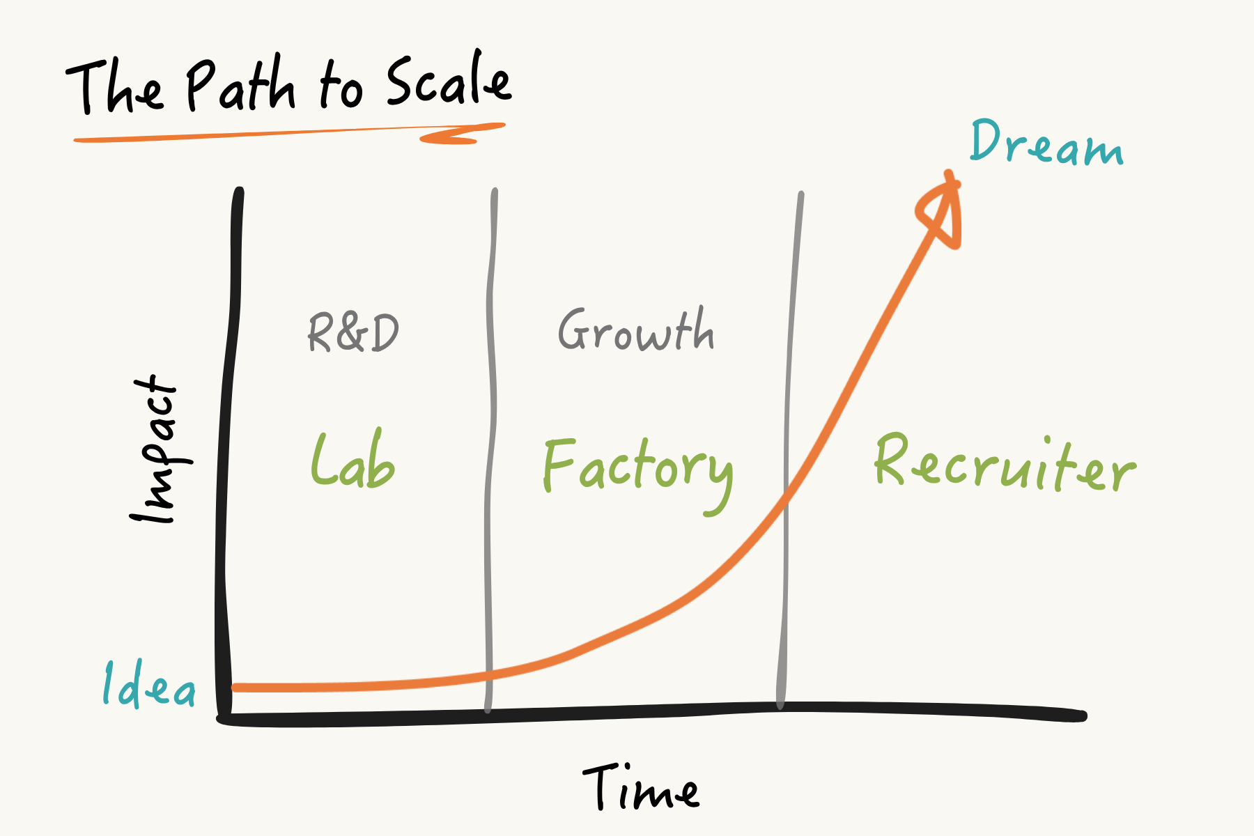 - In Scale stage, exponential impact is enabled by a shift from factory to recruiter.