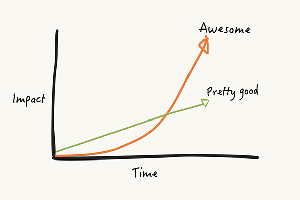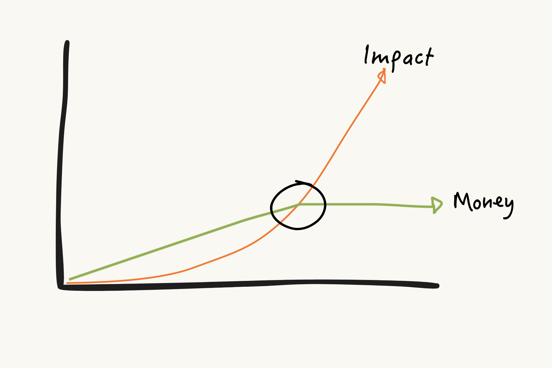 With linear growth, every additional unit of impact requires a corresponding unit of money, so more impact means more money and more organizational growth—forever. However, if you’re doing exponential growth, and you’re making that shift from factory to recruiter, it can look like this: