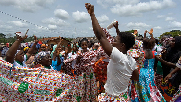 Women in Côte d’Ivoire celebrate the completion of their Village Savings and Loan Association cycle. (Photo by Cheryl Djiro, courtesy of CARE)
