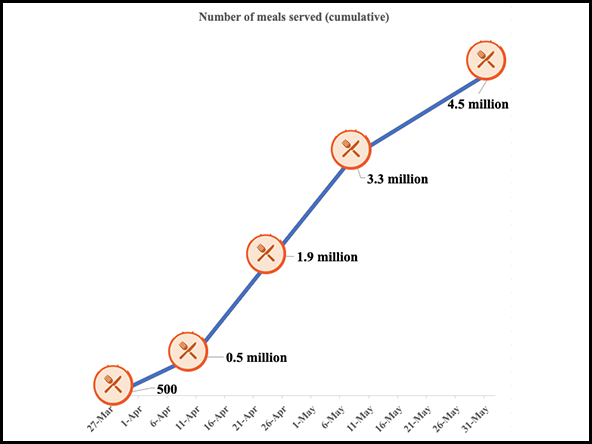 FeedMyCity, a community kitchen initiative in India, started in March by serving 500 meals to families of daily wage earners in one city; by June, it had served more than 4.5 million meals across five cities.