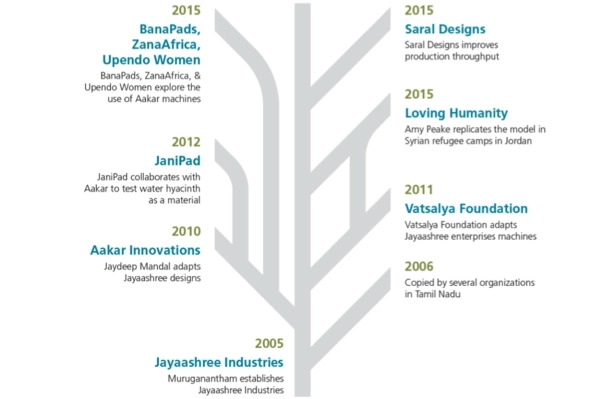 This process has also been taking place more quietly in other sectors. For example, the illustration below shows the evolutionary “tree” of the low-cost sanitary pad manufacturing idea. The idea started with founder Arunachalam Muruganantham founding Jayashree Industries in the south of India, and later spread to the rest of India, the Middle East, and Africa via a diverse range of entrepreneurs. Similar to the previous example, later entrepreneurs such as Jaydeep Mandal were more intentional about building a scaling business, and brought new skills around product design and marketing that further developed the original idea.