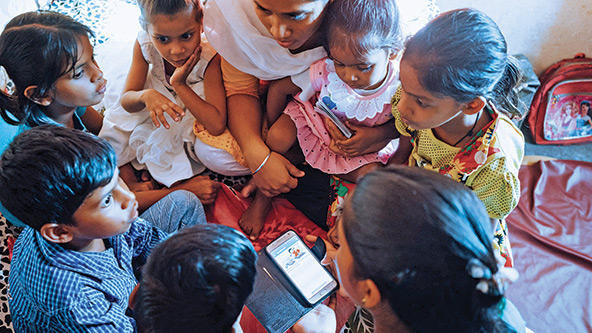 Children in Delhi, India, participate in a digital book story time as part of the Read to Kids program. (Photo courtesy of Worldreader)