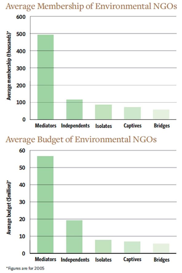 These maps (which will be discussed in more detail later) reveal that there are in fact five different types of ENGOs (Isolates, Captives, Independents, Bridges, and Mediators), not just two (bright and dark greens), and that each of these five types of ENGOs plays a different yet important role in defining and advancing the goals of the environmental movement.