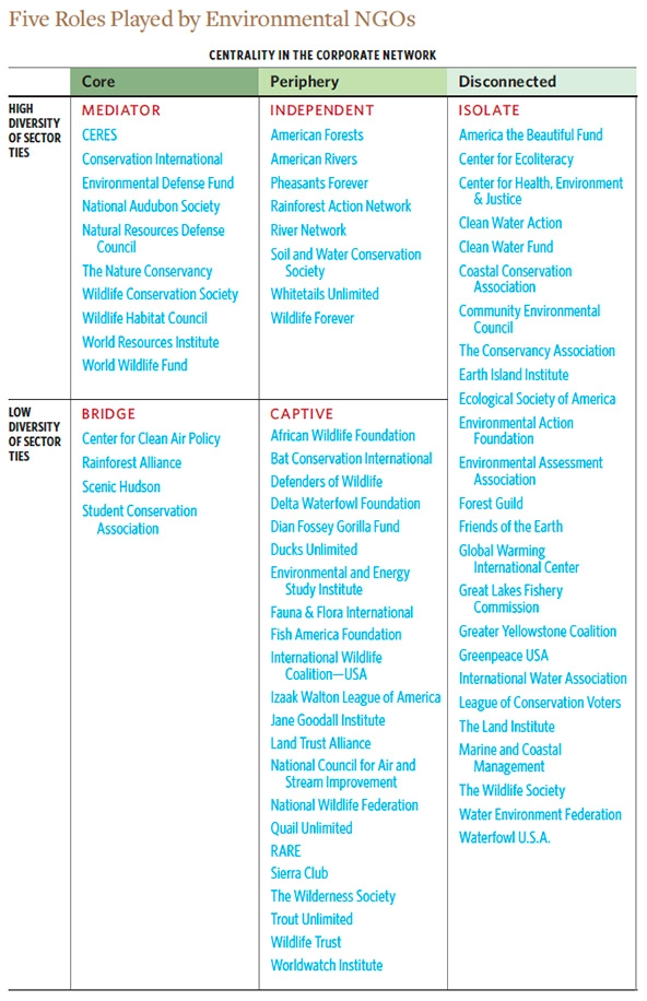 Using these network maps, we should make two important distinctions when we analyze an ENGO’s relationships with corporations. The first is the ENGO’s position between the core and the periphery of the corporate network. The second is the diversity of sectoral ties that the ENGO has. These dual distinctions create a matrix of five possible roles that an ENGO can adopt to engage with corporations (see table on right). The five roles are Isolate, Mediator, Bridge, Independent, and Captive.