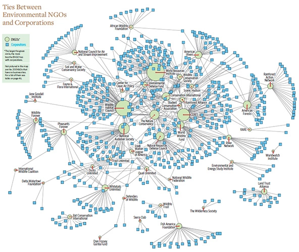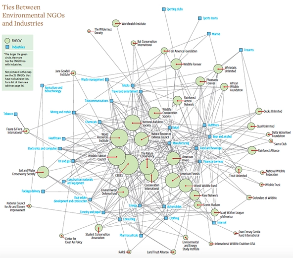 To better understand the complex and varied ways that ENGOs and corporations interact, it helps to use social networking software to draw visual maps of the environmental movement. These types of maps have been used in a variety of fields to help people gain greater insight into the relationships that exist among groups of people or among groups of organizations.