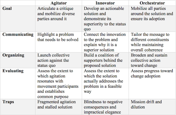 In this article, we build on research on social change,1 including our own research,2 for which we studied hundreds of social change initiatives over multiple years and interviewed social entrepreneurs, civil society leaders, and public officials around the world. We identify three distinct roles played by those who participate in movements for social change: agitator, innovator, and orchestrator. An agitator brings the grievances of specific individuals or groups to the forefront of public awareness. An innovator creates an actionable solution3 to address these grievances. And an orchestrator coordinates action across groups, organizations, and sectors to scale the proposed solution. Any pathway to social change requires all three. Agitation without innovation means complaints without ways forward, and innovation without orchestration means ideas without impact.