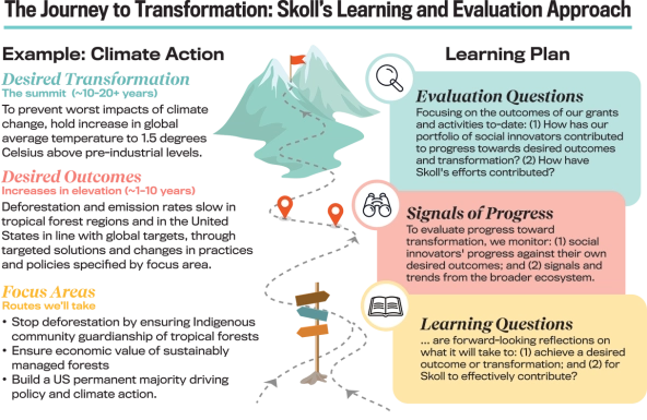 The Skoll Foundation took Safeena’s challenge seriously as we evolved our strategy and our MEL approach to recognize the importance of collective action in driving durable change. Our portfolio, team, and peers in the practice of the Equitable Evaluation FrameworkTM push us to reflect on the dominant norms that shape philanthropic MEL practices today. MEL strategies, when designed around principles of collaboration, equity, adaptation, and a systems-change orientation, can help different entities working on a common cause align on what they want to learn and do together.