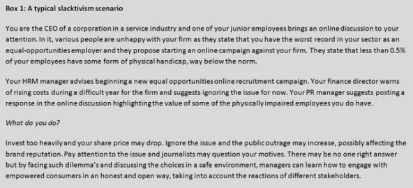 In sum, firms have a lot to gain by entering into the online dialogue and aligning their brand’s values with those of the consumers they serve beyond the traditional marketing message. And they have a lot to lose when they fail to connect to the growing slacktivist majority. We believe that a slacktivism serious game fills the knowledge and skills lacuna of firms in a fun, involving, and risk-free way.