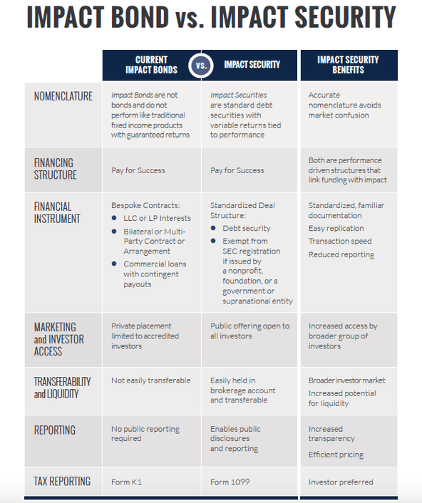 These issues raise several questions: What if we could tweak the formula? What if an impact bond was actually a debt security—a financial instrument similar in legal structure to a corporate bond or municipal bond that can be bought or sold between various parties and has basic standardized terms such as obligations to make payments to investors upon the occurrence of certain events? In other words, what if we combined the pay-for-success model with an established, scalable, and tradable capital markets structure, and named it accordingly? And what if we called it an “impact security”?