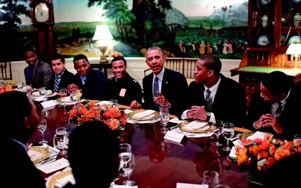 President Barack Obama meets with My Brother’s Keeper mentees during a lunch in the White House Diplomatic Reception Room. (Courtesy of The White House/Alamy Photo)
