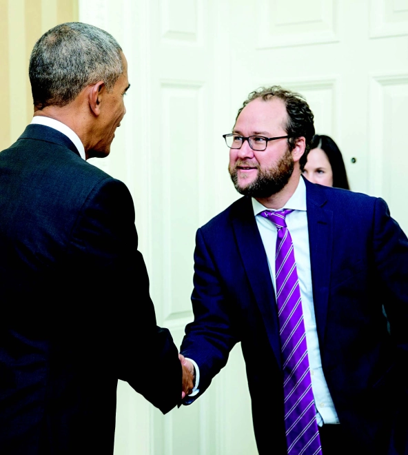 Innovation, shakes hands with President Barack Obama. (Photo courtesy of The White House)