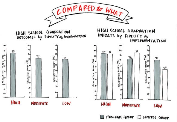 Graduation rates without a comparison seem to map to expectations, but introducing a control group showed that moderate-fidelity sites were underperforming, while low-fidelity sites were having more impact.(Image by Karyn Knight Detering, Collective Next)