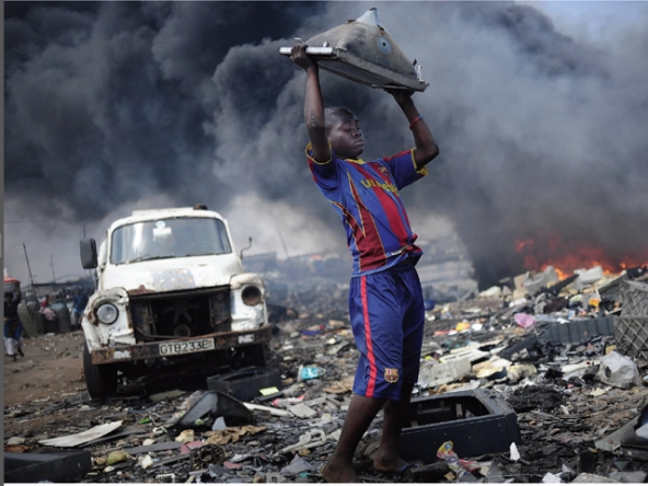 Every year the United States, the United Kingdom, and a host of other industrialized nations ship (often illegally) cargo containers filled with unwanted electronic waste off to less developed countries for disposal. One of the places this e-waste ends up is Agbogbloshie— nicknamed Sodom and Gomorrah—a low-income suburb of Accra, the capital of Ghana. There, workers (often teenage boys) comb through the detritus of Western society looking for anything that might be of value. Sometimes they are able to retrieve whole parts, like a disk drive. In most cases they break up the gear, often burning it, to reveal valuable metals such as copper, aluminum, and even gold. What remains is discarded on land that abuts a coastal lagoon that flows into the Atlantic Ocean.
