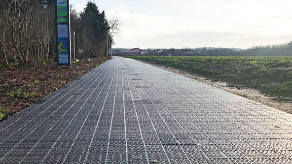 The solar road that Donald Müller-Judex has developed is made up of coaster-sized tiles with corundum-covered crests that support car tires and valleys that collect dirt and grime. (Photo courtesy of Solmove)