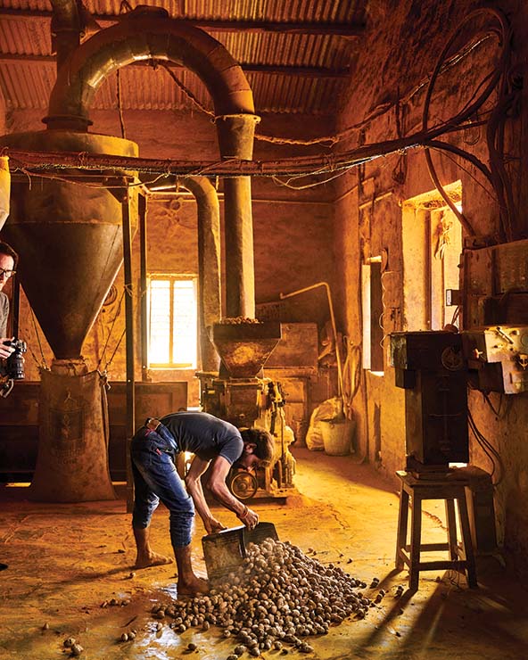 A farmworker milling heirloom Pragati turmeric during the 2020 harvest at the Kasaraneni family farm in Vijayawada, Andhra Pradesh, a coastal region in southeast India. (Photo courtesy of Diaspora Co.)