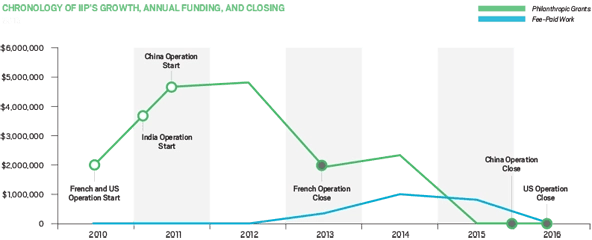 To make up for the loss in funding from its founding philanthropies, IIP began making drastic cost-cutting measures and started raising consulting revenues from fee-for-service projects. Despite the success of this work, it was difficult to sustain the organization exclusively through these revenues. Core funding to cover 30-40 percent of our overall costs for an additional three years would have helped us survive the intervening period while we built a bigger stable of fee-for-service clients.