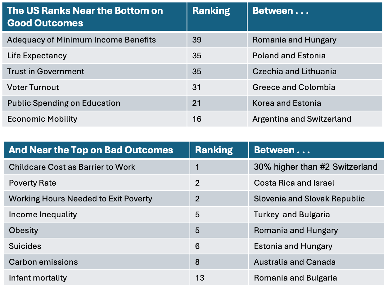United States’ Rank Among OECD Countries on Social Issues | Data collected from the OECD, the Pew Research Center, and the Stanford Center on Poverty and Inequality show that the United States ranks toward the bottom among OECD countries on positive social outcomes and ranks near the top on negative outcomes—adjacent to countries we rarely think of as our peers.