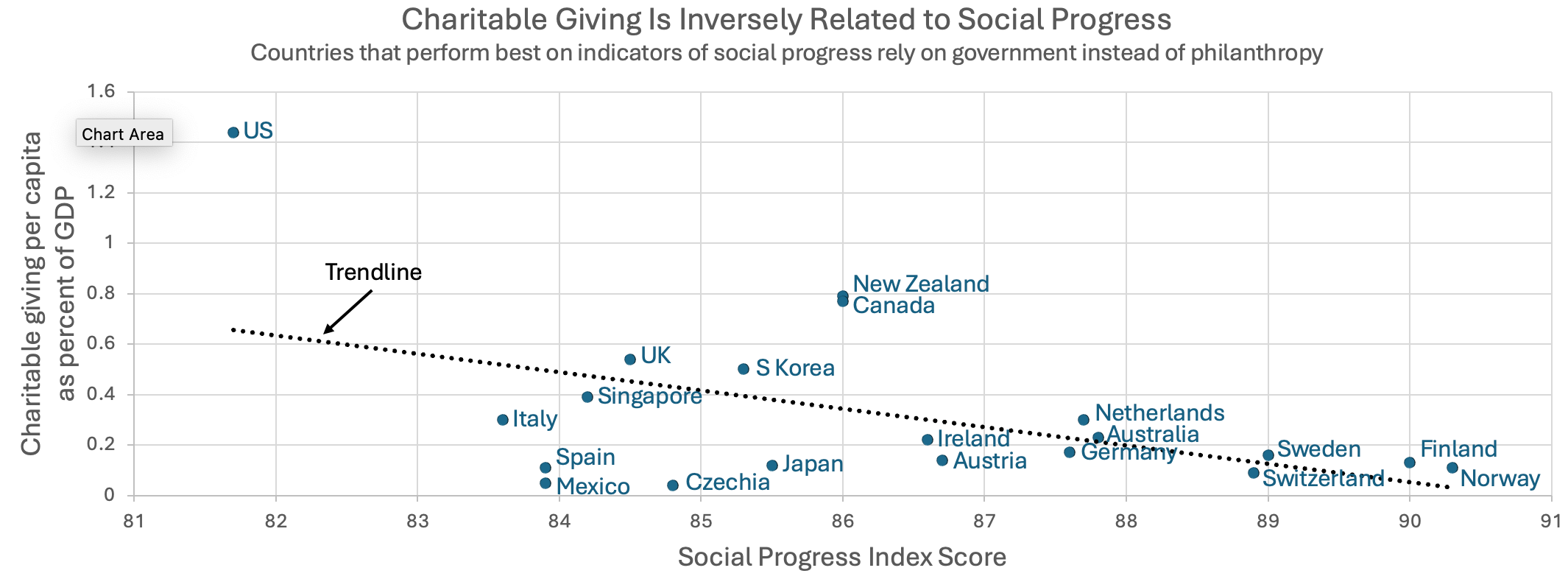One could argue that social and environmental conditions would have worsened even more without philanthropic interventions. Philanthropy has funded numerous impactful programs that have aided many millions of people. Yet abundant evidence proves that philanthropy cannot solve societal problems on a national scale. Indeed, the United States leads the world by a wide margin in philanthropic giving per capita, but it ranks near the bottom of Organisation for Economic Co-operation and Development (OECD) countries on many measures of social well-being and at the top among many social ills. From 1990 to 2022, while real charitable giving doubled, the United States’ ranking on social progress compared to other countries dropped from 8th to 31st. This mismatch between charity and well-being is not limited to the United States. Countries with the highest per capita charitable giving—the United States, Canada, and the United Kingdom—tend to perform poorly on measures of social progress. The countries that perform best—Scandinavian countries, Germany, and Japan—give to charity as little as 2 percent of what the United States gives per capita, relying on government rather than philanthropy to meet their society’s needs.