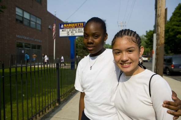 Students at Marquette Elementary School in the Chicago Lawn neighborhood. A focused partnership led by SWOP with school leadership has expanded community and parental engagement at the school and increased quality of educational performance. (Photo by Eric Young Smith/LISC Chicago)