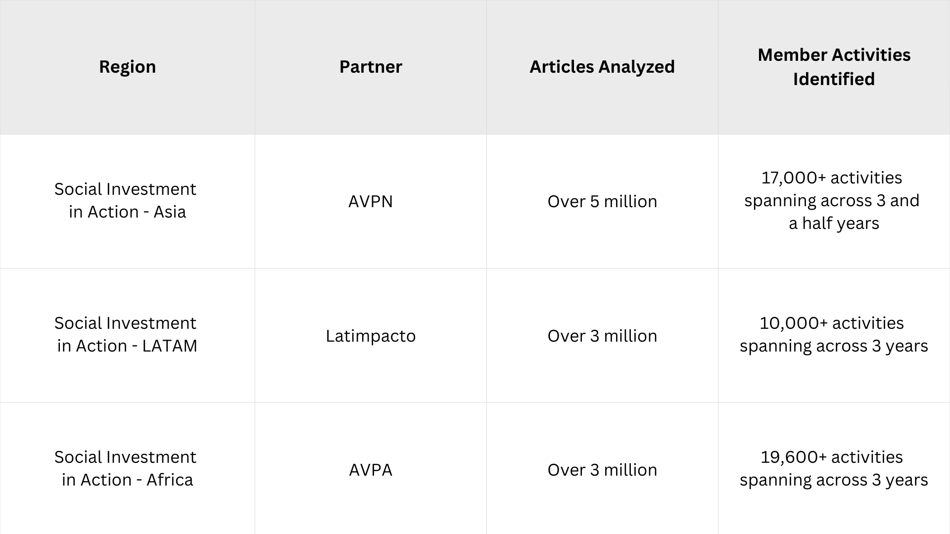 A comparison of three regional Social Investment in Action tracking monitors across Asia, Latin America, and Africa, highlighting partner networks and large-scale article analysis used to monitor ecosystem activity over time.
