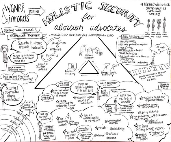A webinar hosted by inroads and Women’s Global Network for Reproductive Rights to observe International Day for Safe and Legal Abortion included looking at how to expand digital security practices to involve the entire abortion advocacy community and deal with the field’s specific risks. (Illustration courtesy of inroads, Hope Tyson 2017)