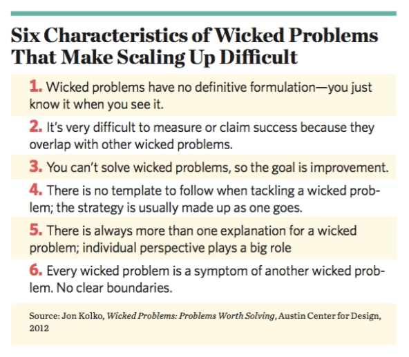 As a field, development is fond of linear approaches to problem solving. But not every social challenge can be codified into incremental, quantifiable goals, as those of us working on rights and justice issues know only too well. Part of the problem is that rights-based issues are “wicked”—that is, they are extremely complex, and their complexities vary by geography and population. (See “Six Characteristics of Wicked Problems That Make Scaling Up Difficult” below.) As such, they defy the increasingly robust models that exist for growing certain development programs, especially those that are designed to scale up in size. And so, although the root cause of poverty is inequity, rights and justice issues often take a back seat to health, sanitation, and education, where needs are more visible and progress is more easily measured.
