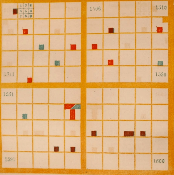 Elizabeth Peabody brought people together around historical visualizations she created on giant quilts. (1856 - Image by the Digital Humanities Lab at Georgia Tech)