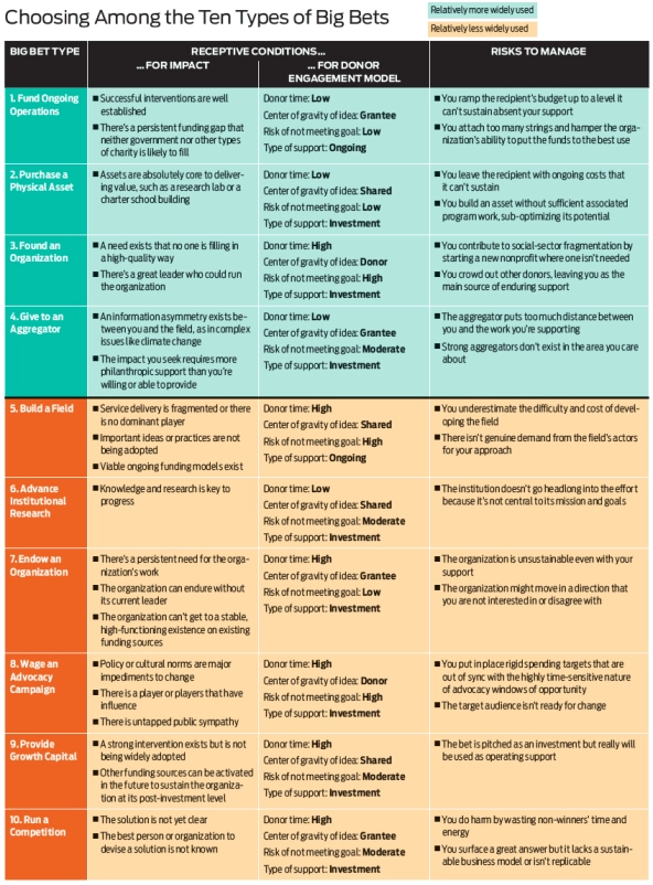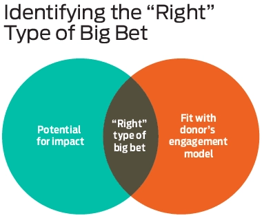 For example, some believe that government is the most important lever for lasting change, while others are generally skeptical that government can be influenced. An investor may want to provide growth capital to a promising nonprofit, while a corporate founder may be more inclined to start a new nonprofit initiative. There are also real differences in the time, staff, and risk appetite they bring to their philanthropy. For a successful big bet to occur, it must be both a promising way to address a problem and a good match with the donor’s engagement model.