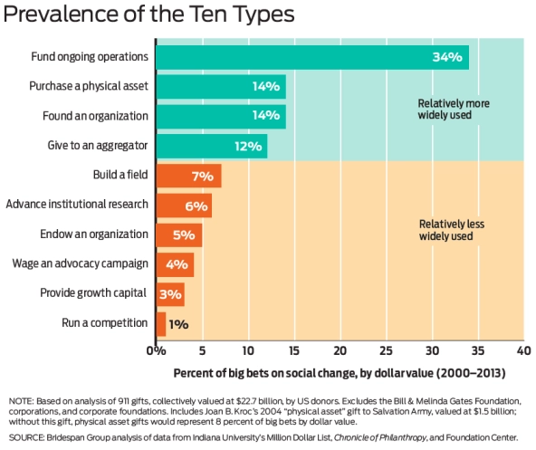 The good news is that there are a number of ways donors can deploy their resources to make a big difference. Below are 10 distinct and significant ways to place a big bet on social change. The list is not exhaustive—but almost every big bet on social change in a sample of more than 900 gifts of $10 million or more in our 2000-2013 database falls into one of these categories. Since some fall into more than one category, we tried to judge which single category best described the form and purpose of the gift. We present the 10 types in order of their decreasing prevalence.