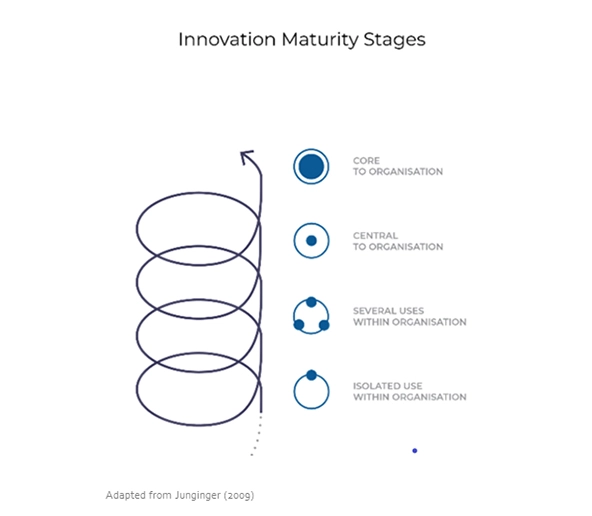 From our conversations with development professionals, we have found significant similarities in the journeys of those that have successfully adopted innovation. It’s likely to start with a series of unconnected experiments that are brought into a cohort to learn from one another. The next steps happen in parallel and usually span four to six years: