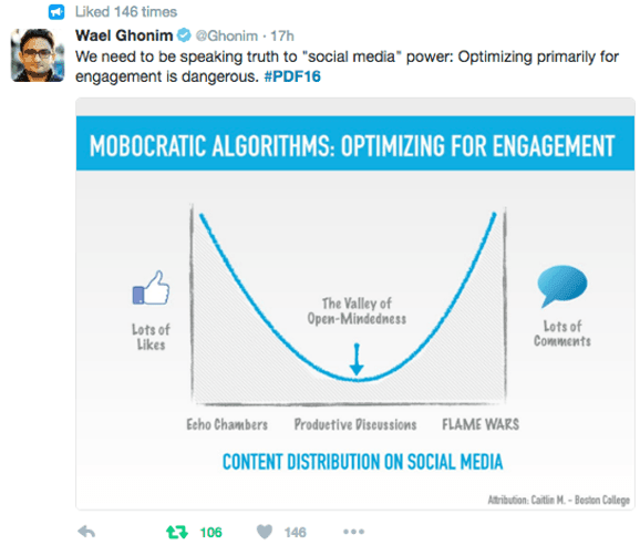 Ghonim is optimistic and happy for the wake-up call issued at the conference—to build the tools we need to promote a more respectful public discourse. He agrees that building a more democratic, civil space online won't be easy, but believes it's technically doable. "You can build algorithms and experiences that are designed to get the best out of people, and you can build algorithms and experiences that drive out the worst. It's our job as civic technologists to build experiences that drive the best. We can do that. We must do that now."