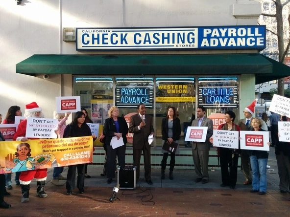 then-San Jose Councilman Ash Kalra, and others, Emmett Carson speaks about the dangers of payday lending at a December 2014 event. (Photograph courtesy of Silicon Valley Community Foundation)