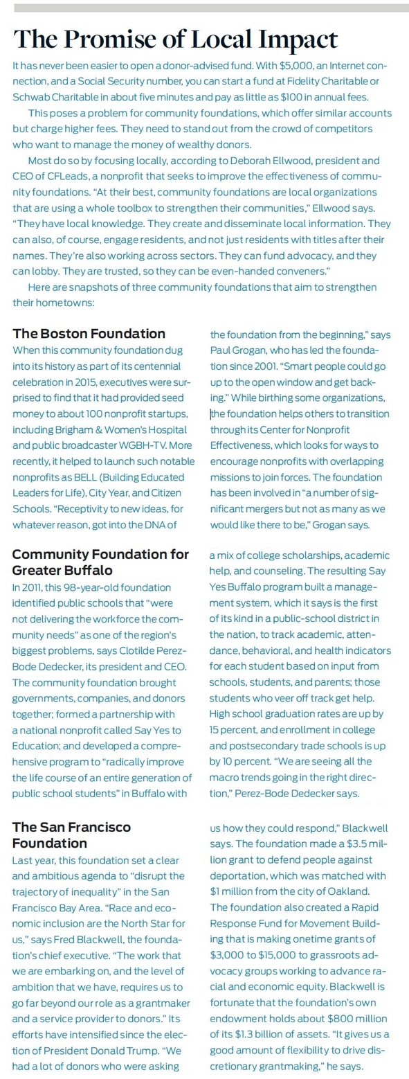 Some say that is a cop-out. Other community foundations advocate for local nonprofits, saying their role is to spotlight local needs and coordinate collective action. (See “The Promise of Local Impact” below.) The two community foundations that merged to form the Silicon Valley Community Foundation were locally focused by design, according to Sterling Speirn, who was president of the Peninsula Community Foundation from 1990 to 2005. “What about the poor kids in East San Jose?” Speirn asks. “Wouldn’t you like to think that their lives are markedly different because they live in the same place as the Silicon Valley titans?”