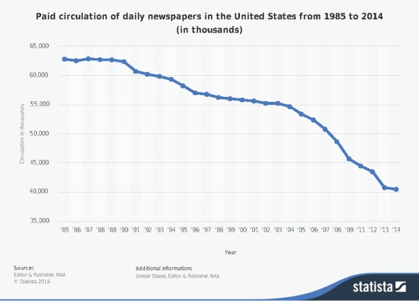 Paid circulation of daily newspapers in the United States from 1985 to 2014. (Image courtesy of The Statistics Portal)