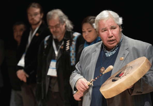 Senator Murray Sinclair beats a drum at the 2015 Indigenous Innovation Summit, an annual event hosted by the National Association of Friendship Centres. (Photograph courtesy of the McConnell Foundation) Clarification: This caption has been modified to reflect that it features Sinclair.