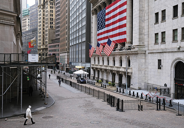 Wall Street in New York City stands empty on March 24, 2020, as people stay away from the area due to the COVID-19 pandemic. (Photo by Spencer Platt/Getty Images)