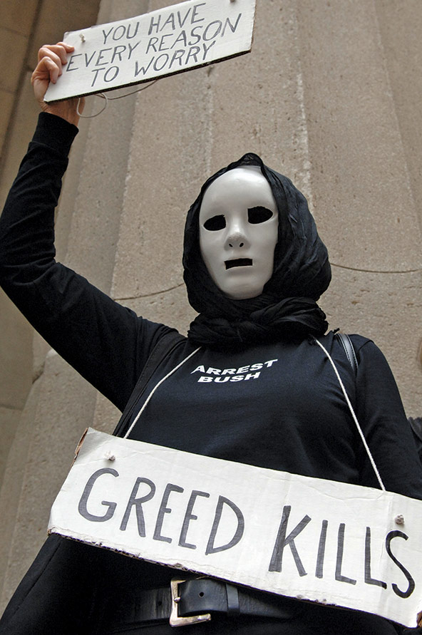 The message was clear: “greed kills.” These were the words emblazoned on the placard worn by a masked protester, one of many gathered in front of the New York Stock Exchange in 2008. It was October, and the demonstrators were outraged at a proposed government bailout of Wall Street banks. The following year, in the heart of London’s financial district, violence broke out as protesters fought with riot police on the streets around the Bank of England and the Royal Bank of Scotland headquarters. Effigies of bankers hung with ropes around their necks amid cries of “Kill the bankers!”
