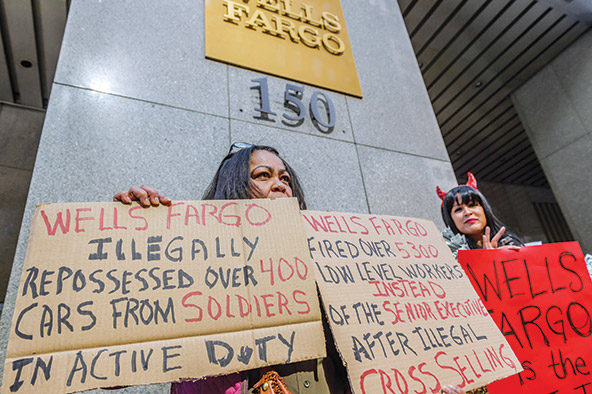 Protesters hold signs outside Wells Fargo’s corporate headquarters in New York City on October 5, 2016, citing the bank’s unethical practices. (Photo by Erik McGregor/Alamy)