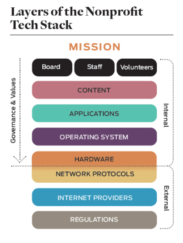 It’s also important to think about the multiple, interoperable layers of digital technology that support your organization’s work. To align your tech stack with your organization’s mission is to identify the points of intersection between software and hardware and your organization’s values. If your organization is working with vulnerable people, for example, you will want to make sure that the software, hardware, and external vendors you use can protect that information and allow access to it in ways that align with your governing board’s responsibilities. Because most nonprofits won’t be in a position to negotiate over shared Internet infrastructure, it’s worthwhile to consider only those layers of the tech stack over which a typical organization can exert some control.2