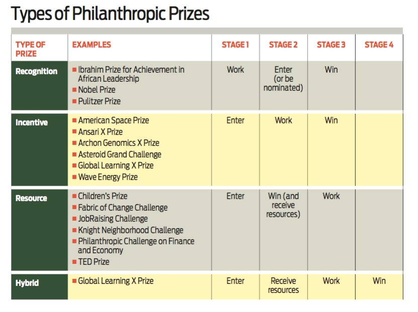 Broadly speaking, there are three types of philanthropic prizes: recognition, incentive, and resource. The main difference between these three types of prizes concerns the sequence of activities that make up the prize competition process: entering (or being nominated), winning, and working. (See “Types of Philanthropic Prizes” below.)