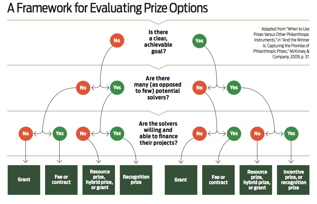 Making decisions on which type of prize to offer—or whether to offer a prize at all—requires funding organizations to consider several factors. The authors of the 2009 McKinsey report presented a diagram to help organizations decide between offering a prize and offering other kinds of financial support. That diagram focused on the use of incentive prizes, in particular, and it drew on the author’s three conditions for ensuring that an incentive prize will be effective. I have adapted the McKinsey diagram to create a framework for evaluating all three prize types, along with non-prize options. (See “A Framework for Evaluating Prize Options” below.) This framework is built around three fundamental questions:
