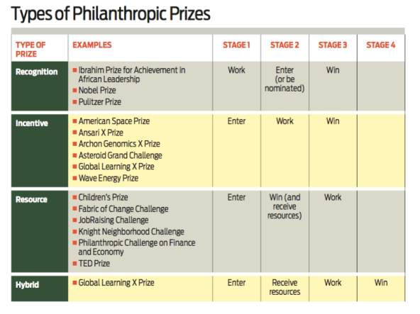 Recently, I served as global impact philanthropy specialist for the Children’s Prize. My work with the prize led me to investigate the current state and future potential of prize philanthropy. In this article, I will survey different types of prizes and provide guidance on the use of resource prizes, in particular. Resource prizes, I have come to believe, have the important attribute of enabling funder organizations to promote social goals while giving recipients the support that they need to bring their projects to fruition.