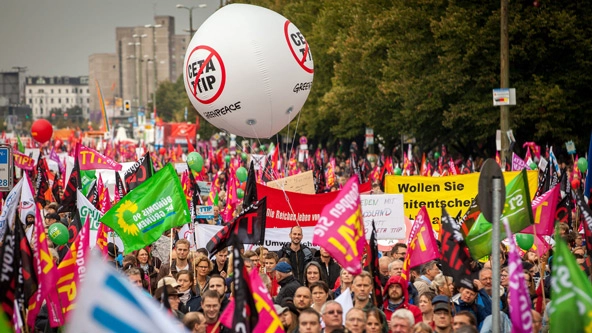 A demonstration against the Transatlantic Trade and Intellectual Property Agreement in Berlin, 2015, included traditional Northern NGOs such as Greenpeace and new digital NGOs such as Campact. (Photo courtesy of Online Progressive Engagement Network)
