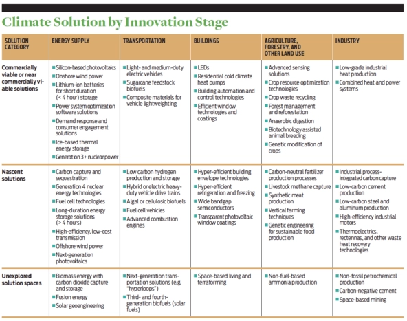 To demonstrate this thesis and bring more granularity to the current debate, we reviewed the best available literature and mapped a subset of climate solutions across the three stages of innovation and onto the Intergovernmental Panel on Climate Change (IPCC) economic sectors. The IPCC breaks the global economy into five broad greenhouse gas-emitting sectors: energy supply; transportation; buildings; agriculture, forestry, and other land use; and industrial production. This mapping is not intended to serve as an exhaustive technology-gap assessment, but rather to demonstrate how certain economic sectors do not currently have a comprehensive suite of economically competitive solutions. Building off of this mapping, we highlight examples of three fields of research that demand further investment in unexplored and nascent solutions as part of a climate change mitigation portfolio.