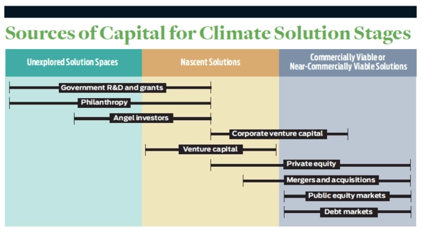 These are just three of many examples of unexplored and nascent solutions for climate change mitigation that are not receiving the funding they require in the current financial landscape. Where is the risk capital to be found to support these areas? We summarize in a chart the sources of capital that are available at each solution stage. Historically, federal governments and philanthropists have funded research in unexplored solution spaces through grants for research. Governments also often support the earliest stages of innovation. For example, the Advanced Research Projects Agency-Energy (ARPA-E) provides government grants to support the development of nascent solutions before and alongside venture capital firms. The US Department of Energy provides Small Business Vouchers through a pilot program to enable nascent companies to partner with national labs, and offers Small Business Innovation Research grants to other businesses.