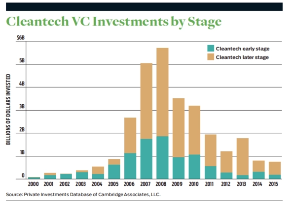 We have reviewed the total level of venture capital (VC) funding across a variety of sectors, including software, biotechnology, medical devices, and climate mitigation, and teased out the amount invested in “clean technology” (cleantech). (We have relied on information provided by Cambridge Associates LLC Private Investments Database—which includes data from institutional VC funds through year end 2015—and the National Venture Capital Association.) The data indicate that funding for climate change solutions experienced a boom and bust. Cleantech VC peaked at 16 percent of total VC dollars in 2010. However, VC funding for climate solutions fell precipitously to just 2 percent of all VC investments in 2015—its lowest level since 2005.