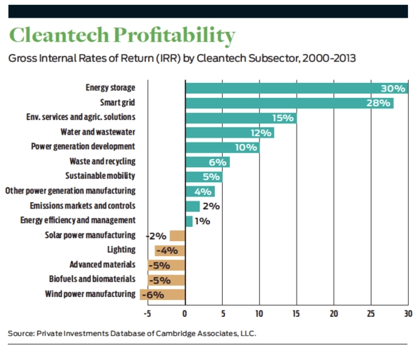 As we demonstrate in a separate chart, investments in hardware and hard-science development ventures have seen low or negative returns for investments made between 2000 and 2013. (See “Cleantech Profitability” below.) These results are echoed in the MIT Energy Initiative’s 2016 report, which reviewed clean technology returns for Series A-round investors. It found that nearly all clean technology companies funded in a Series A round after 2007 failed to return the initial capital invested.9 Over the same period, the S&P 500 gained roughly 50 percent, meaning that a private investor over the same time period could have achieved significantly better returns by investing in an S&P 500 index. The only subsectors that have seen average or above-average returns are those focused on deploying existing technologies. The pooled return for all clean-technology-related venture investments made between 2000 and the first quarter of 2017 was 4.1 percent.
