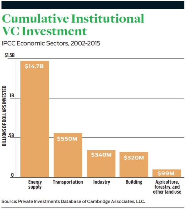 As we have underscored, mitigating climate change requires funding for nascent hardware-, hard science-, and manufacturing-based ventures. But traditional venture funds are not supporting these new ventures to the degree necessitated by climate change. By mapping Cambridge Associates subsectors to the IPCC’s economic sectors, we see that specific economic sectors, such as energy supply, receive the bulk of investment. VC funding has slowed considerably in recent years for biofuels and biomaterials production, solar power manufacturing, wind power manufacturing, other power generation manufacturing, lighting, and advanced materials manufacturing. Funding for ventures that reduce the emissions from agriculture was nonexistent, even though agriculture represents nearly a quarter of all global greenhouse gas emissions.