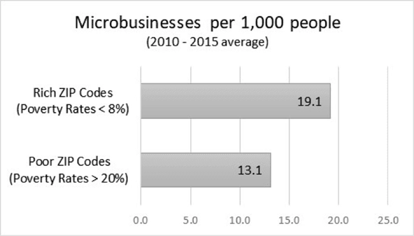 Unfortunately, microbusinesses are not uniformly distributed across communities. On the contrary, data from the Census Bureau’s County Business Patterns Survey reveal a pronounced gap between wealthy and poor residential ZIP codes in urban areas around the country. On average, the ZIP codes with the highest poverty rates have 31.5 percent fewer microbusinesses per 1,000 people.