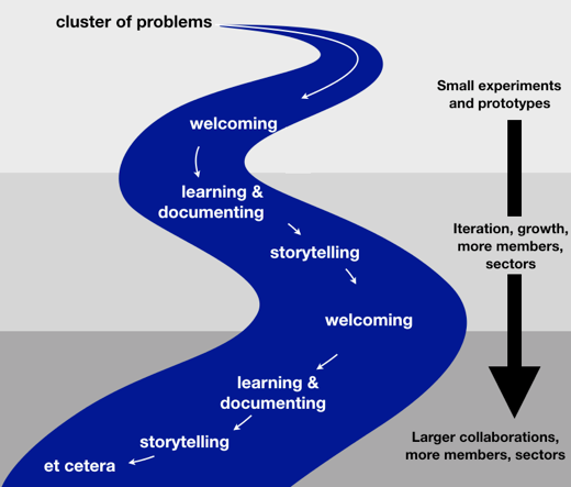Starting with a cluster of tough problems, and steered by the three principles listed above, multisolving projects grow in wisdom, impact, resources, and breadth of partnership via an iterative process that is constantly welcoming new partners, learning and documenting results, and building a narrative of what is possible. (Image by Elizabeth Sawin)